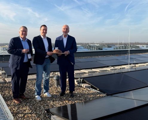 Die Begrüßungspräsente an LUPIXX-Geschäftsführerin Saskia Olma und den neuen Oertel & Prümm-Bereichsleiter Julian Deget überreichten EUREF-Vorstand Reinhard Müller und Standortleiter Jörg Philippi-Gerle.